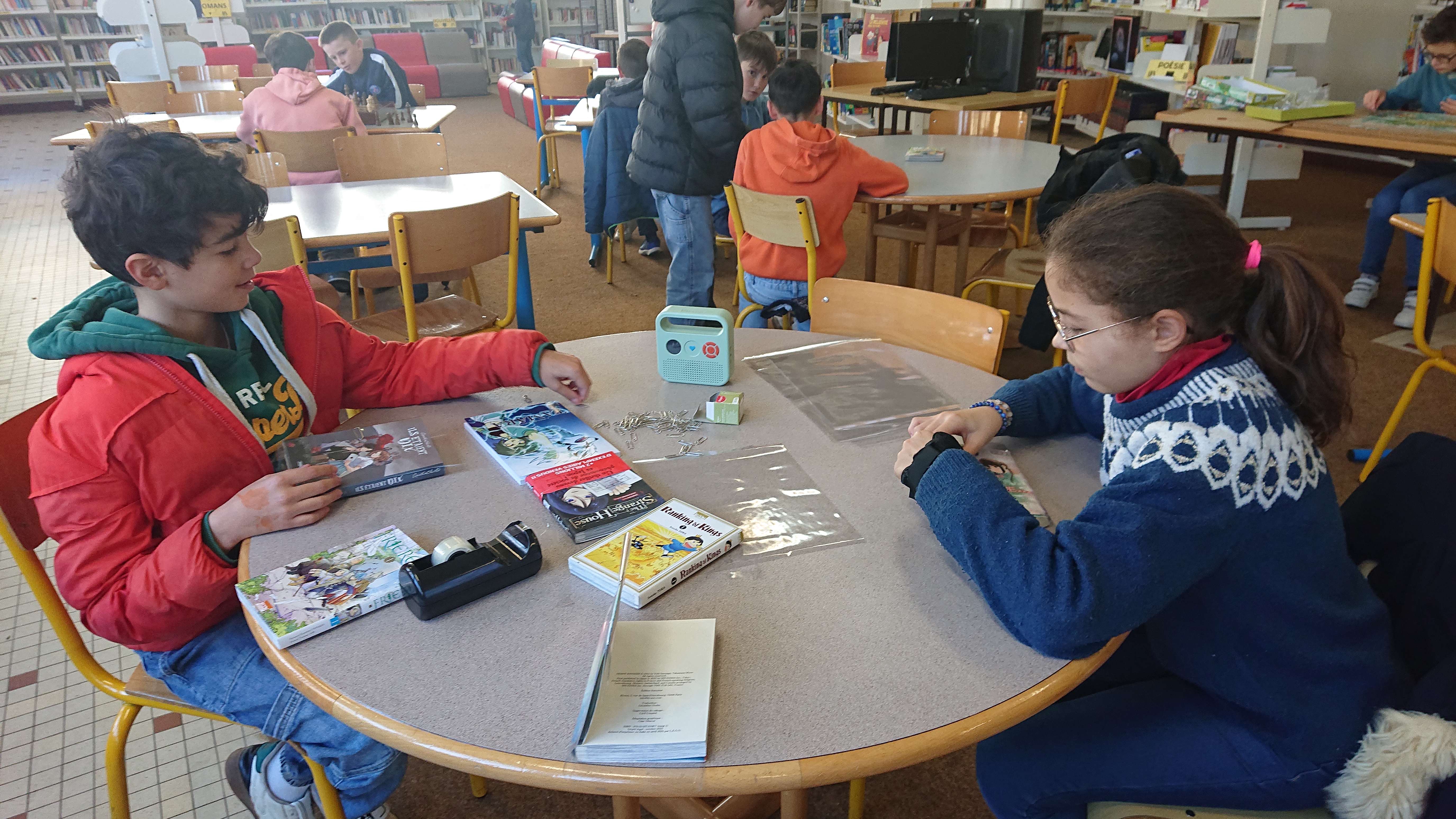 Ils participent aux tâches quotidiennes : couvrir les livres, les ranger, coller des cotes, étiqueter des livres, tamponner les nouvelles revues, trier les magazines, ...