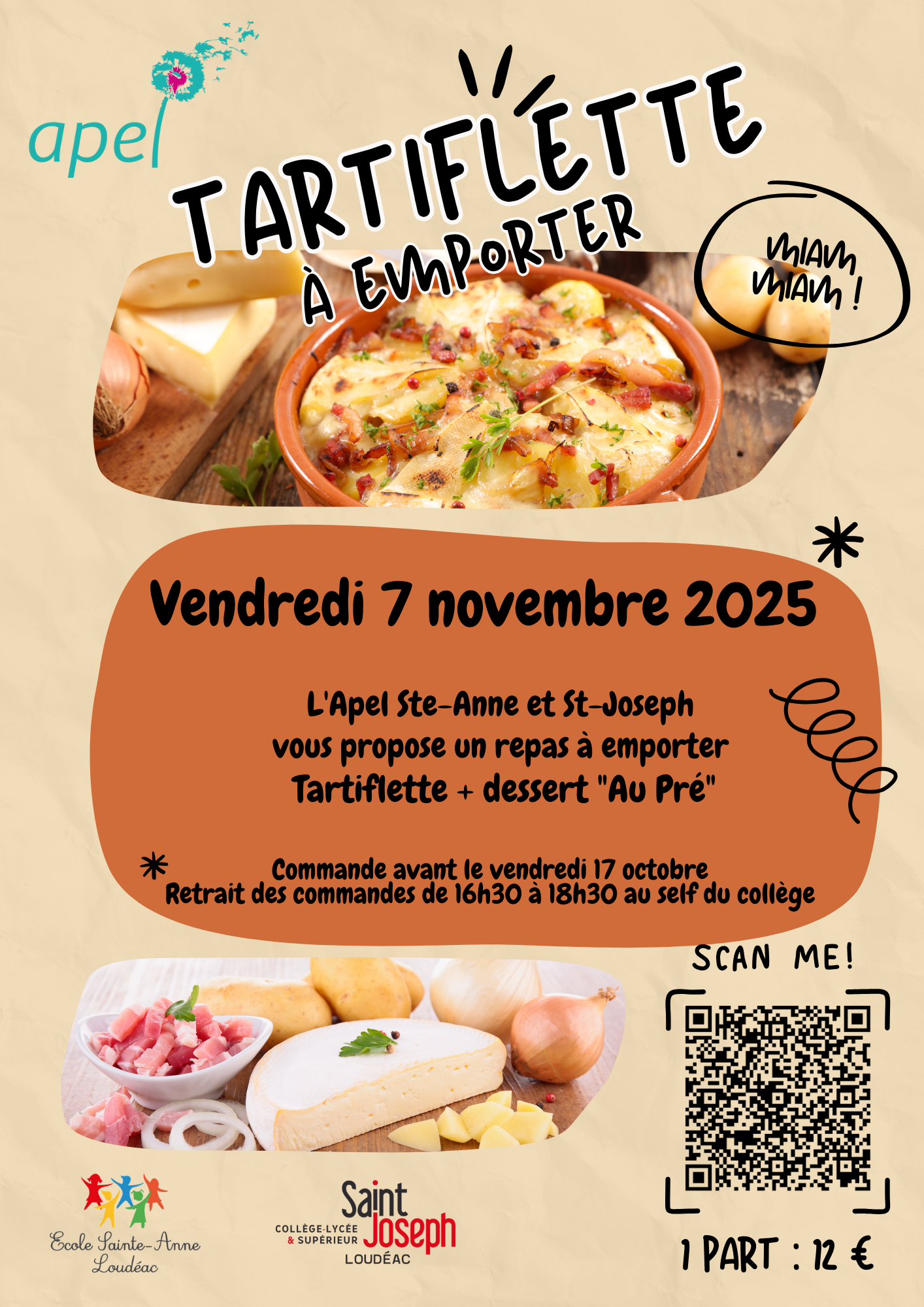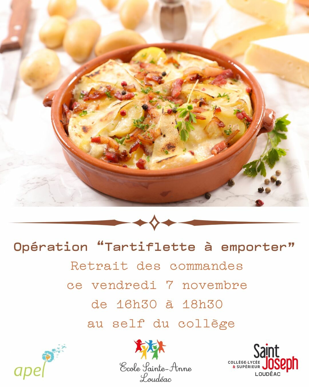 L’APEL Ste Anne et Saint Joseph organise une vente de tartiflette à emporter au profit des voyages scolaires !